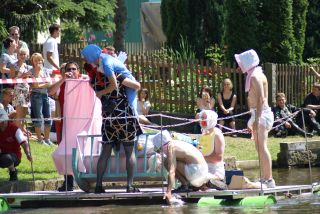 In diesem Fall hat die 13. dem Ullersdorfer Dorfteichfest kein Unglück gebracht. Im Gegenteil durch das schöne Wetter am vergangen Wochenende nutzten viele Ullersdorfer und Gäste aus der Umgebung die verschiedensten Angebote zum Fest. So wurde am Freitagabend beim Rommee und Skatturnier kräftig gespielt. Am Samstag wurde erstmalig, auf Wunsch der Kinder, beim Kinderbadewannenrennen spontan die "Schönste Wanne" prämiert. Am Rande des Teiches wurde am späteren Nachmittag der Meister im Trabbi-Ziehen ermittelt. Sonntag ging es dann rasant und spannend beim legendären Badewannenrennen über den Dorfteich zu. Bei einem fast zeitgleichen Start gab es ein aufregendes Finale, wobei sich am Ende die Volleyballer des SC Erksdorf/Ullersdorf durchsetzen konnten. Den 2. belegten Sabel´s Flaschenkinder aus Weißig, den 3. die SG Ullersdorf Fußball und den 4. Platz die Happy Tank´s. |