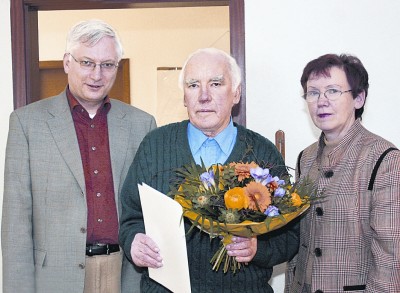 Blumen für Ullersdorfs Sportler-Urgestein Siegfried Böhme gab’s von Landrätin Petra Kockert und Ortsvorsteher Frank-Peter Wieth.Fotos (2): M. Trapp