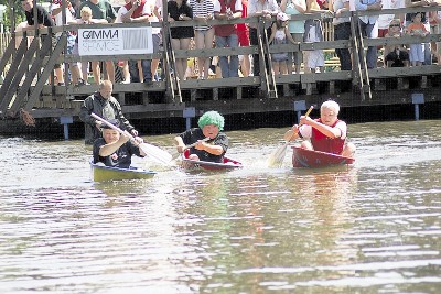 Ullersdorfs Ortsvorsteher Frank-Peter Wieth (r.) und Großerkmannsdorfs Orts-Chef Harry Hauck (m.) im Wettstreit auf dem Ullersdorfer Dorfteich.